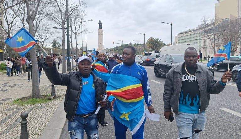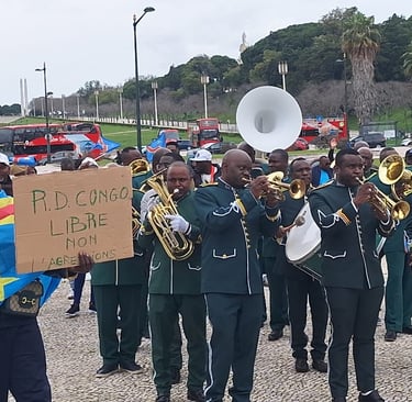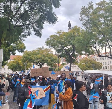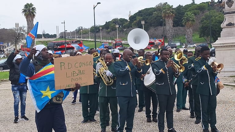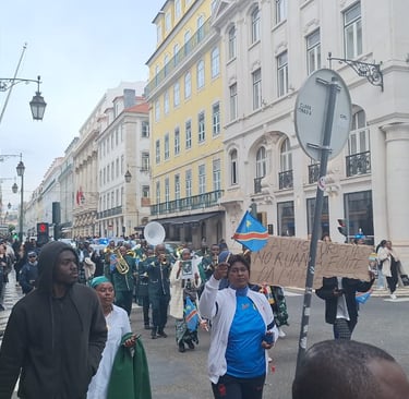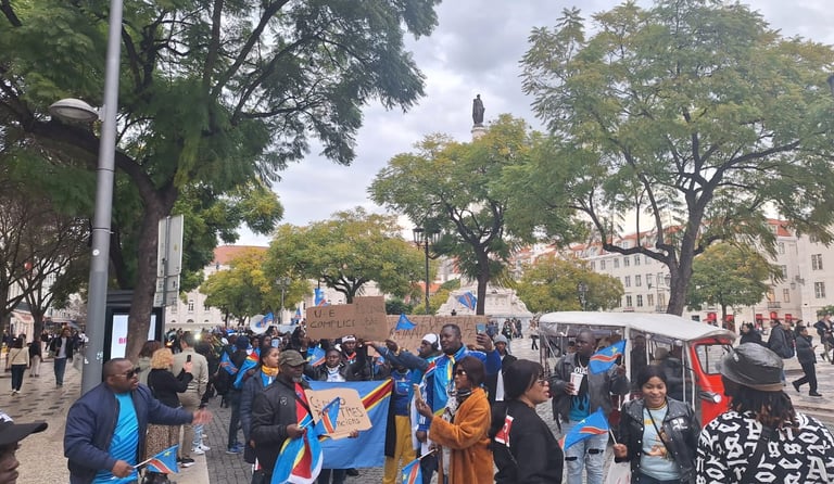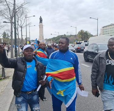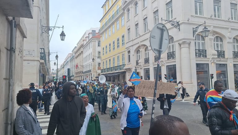 Ils étaient environs 3500 personnes, hommes, femmes, enfants, en majorité binationaux, la diaspora congolaise de Portugal rassemblée pour une marche contre la guerre en République démocratique du Congo ; Au son des fanfares Kimbangustes, drapeaux de la RDC en mains, pancartes dénonçant la lassitude et la complicité de l’UE, slogans anti Kagame et ses complices ont retentis dans les rues de Lisbonne avec comme point de départ le rond-point Marques de Pombal au centre de Lisboa jusqu'à la place emblématique Plaça do comercio devant l'Arc de triomphe de Rua Augusta.
